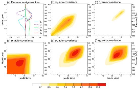 Vertical eigenvectors and vertical auto-covariance of hydrometeors. (a) First-mode eigenvector of hydrometeors, the horizontal axis is eigenvector value. (b–f) The vertical auto-covariance (units: 10−9 kg2/kg2) of (b) , (c) , (d) , (e) and (f) , the horizontal axis is model level. The left vertical axis is model level, and the right vertical axis is the pressure level (units: hPa).