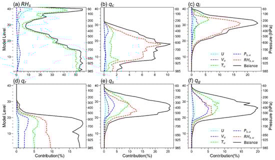The magnitude arising from the balance part in the physical transform () reflects the correlations between two CVs. Figure 2 shows the vertical distribution of the balanced part contribution to pseudo relative humidity () and hydrometeors. The larger the contribution, the stronger were the correlations between the two CVs. The contribution of conventional control variables to the balanced part of the liquid hydrometeors (Figure 2b,d) was located mainly in the middle and lower troposphere, whereas that of the solid hydrometeors were located in the middle and upper troposphere (Figure 2c,e,f). The contributions to hydrometeors came mostly from unbalanced temperature (), unbalanced pseudo relative humidity (), and unbalanced surface pressure (). Moisture is the source for hydrometeors, whereas latent heat provides the energy for the moisture’s phase transformation, which can be seen in Figure 2a, where the unbalanced temperature () had the greatest contribution to pseudo relative humidity (). In addition, unbalanced surface pressure () was also closely related to hydrometeors, especially the precipitable hydrometeors (, and ), which reflected the close connection between low pressure and precipitation. Based on the weak correlations between zonal and meridional wind ( and ) and other basic variables that were found by Sun et al. [29], we further found that and were also weakly correlated with hydrometeor variables.
