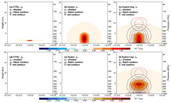 Cross-sections of analysis increment of , , and by assimilating single radar reflectivity observation at 26.5°N in CTRL (the left column), Hydro (the center column), and Hydro+reg (the right column) experiments: (a–c) (shaded, units: 10−2 g/kg), (red contour, units: K) and (black contour, units: g/kg); (d–f) (shaded, units: 10−2 g/kg), the and were set in the same way as (a–c). The horizontal axis represents the longitude, the left vertical axis is model height (units: km), and the right vertical axis is the pressure level (units: hPa).