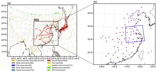 Model grid configuration and observation stations distribution. (a) Domain configuration and the conventional observation stations distribution; (b) D02 configuration and the radar observation stations (purple points), where the blue box is the evaluation area in cycling data assimilation and forecasting experiments.