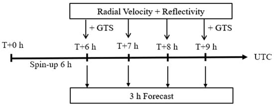 The three schemes mentioned in Section 3.3 (Table 1) were applied to generate parallel radar data assimilation and forecasting experiments. The procedures followed in these three schemes are shown in Figure 5. A 6-h spin-up was performed using the analysis and forecast field of the Global Forecast System (GFS), then the Global Telecommunication System (GTS) observations (Figure 4a) were assimilated in d01 and d02 at 3 h intervals with an assimilation window of ±1 h. Radar data from 78 stations (Figure 4b) were only assimilated in d02 at 1 h intervals with an assimilation window of ±3 min, and the radar observations were thinned to a resolution of 5 km to reduce correlations among observations. Similar to Sun et al. [23], only reflectivity above 25 dBZ was assimilated.