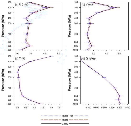 The 20-cycle-averaged root mean square error (RMSE) of , , , and specific humidity () in the main precipitation area (29°–35°N, 115°–123°E; blue box in Figure 4b) of the 3 h forecast was calculated with reference to the 5th generation climate reanalysis dataset from ECMWF (ERA5–0.25o) [58] and is shown in Figure 6. Compared with the CTRL, Hydro had a slightly smaller RMSE at some levels for these four variables, indicating that the propagation of vertical observations could have a slightly positive effect. After considering the multivariable correlations in assimilation, the RMSE of these four variables reduced at most levels. The forecasting capability of the model variables in Hydro+reg were improved, relative to the case with only vertical correlations. However, the low resolution of the reference field (ERA5–0.25°) compared to the model field (5 km) might lead to a dilution of the assimilation effect, resulting in some levels being statistically insignificant. Even so, the Hydro+reg could still show neutral to positive effects.