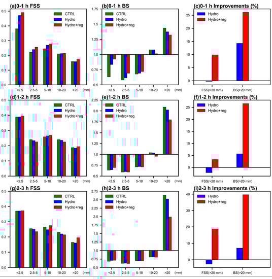 Figure 7 shows the 20-cycle-averaged FSS, BS and improvements in the percentage compared to the CTRL experiment for the cumulative precipitation forecast for each hour in the main precipitation area in the five cases. In the first hour (Figure 7a,b), the FSS in the Hydro experiment was higher than that in CTRL for most magnitudes of precipitation, and the BS was closer to 1. Compared to the CTRL and the Hydro experiment, the Hydro+reg experiment had the highest FSS, and the BS was closest to 1. In the second and third hours (Figure 7d,e,g,h), the FSS in the Hydro experiment became similar to that of the CTRL experiment, but the BS of heavy precipitation (>20 mm/h) remained closer to 1 than in the CTRL experiment. Compared to the CTRL and the Hydro experiment, the Hydro+reg experiment still had the highest FSS, and the BS was also closest to 1.