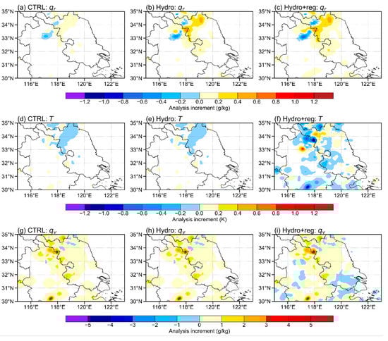 Analysis increment at level 16 of (a–c) (units: g/kg), (d–f) (units: K) and (g–i) (units: g/kg) in CTRL (the left column), Hydro (the center column), and Hydro+reg (the right column) experiments.