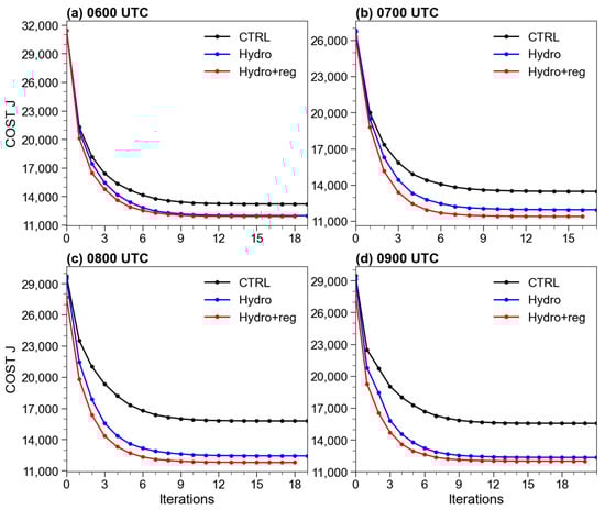 The cost function is also shown in Figure 10, and was used to investigate the impacts of vertical and multivariable correlations on actual radar data assimilation. Note that the cost function in Hydro was smaller than in CTRL at the first cycle and was further reduced in Hydro+reg. In addition, the cost function minimized faster in Hydro+reg than in CTRL and Hydro (Figure 10a); this was maintained in further cycles, whereas the difference between these experiments gradually increased (Figure 10b,c). Therefore, the minimization of the cost function improved when the vertical correlations were included. The multivariable correlations further accelerated the convergence of minimization.