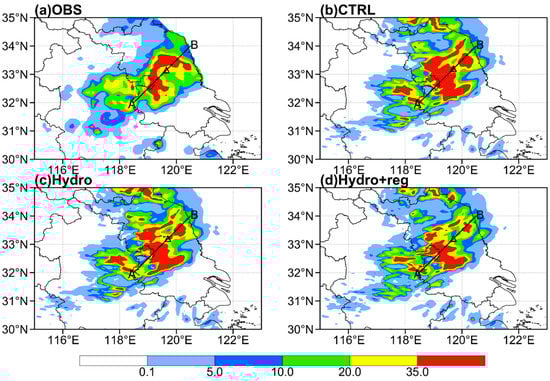 Distribution of 3-h accumulated precipitation forecast from 0800 UTC to 1100 UTC on 6 July 2019, in main precipitation area (units: mm), and the triangle is the position of (33.2°N, 119.7°E) where Skew-T plots will be analyzed: (a) Observation, (b) CTRL, (c) Hydro, (d) Hydro+reg. The black line A(32°N, 118.5°E) −B(34°N, 120.5°E) indicates the position of the vertical section shown in Figure 13.
