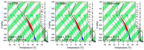 The Skew−T plots over (33.2°N, 119.7°E) in the initial field after 3 cycles from (a) CTRL, (b) Hydro, and (c) Hydro+reg experiments. The blue and the black lines indicate the dew point temperature and the ambient temperature, respectively. The shadow in red indicates convective available potential energy (CAPE).