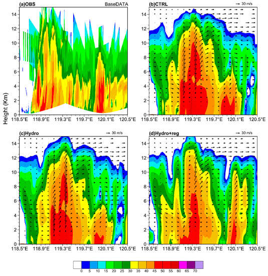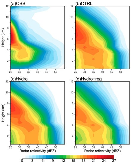 To further analyze the causes for the precipitation improvements, Contoured Frequency by Altitude Diagrams (CFADs) [61] are shown in Figure 14, which displayed the frequency distribution of reflectivity [per bin size (~0.5 km × 5 dBZ)] as a function of height. Since weak reflectivity has a small effect on convective weather processes, only reflectivity above the 25 dBZ threshold are shown in this paper. For CTRL (Figure 14b), the frequencies of strong radar reflectivity at the middle and lower atmosphere were much stronger than the observations (Figure 14a), resulting in stronger precipitation (Figure 11b). The frequencies of Hydro (Figure 14c) were slightly reduced compared to CTRL. After considering multivariate correlations, the frequencies of strong radar reflectivity in Hydro+reg (Figure 14d) was further reduced. as well as being closer to the observations. This phenomenon was consistent with the cross sections of radar reflectivity (Figure 13).