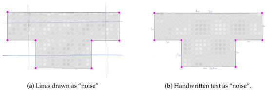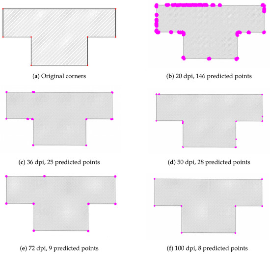 As mentioned above, the corner estimation is highly influenced by the quality of the input image (resolution, contrast, sharp edges, etc.). Especially for low-resolution images, i.e., below 100 dpi, false corners are detected. The false corners predictions can be removed. In our example, the number of estimated corners varies between 146 (for 20 dpi) and 8 (for 100 dpi); true value was 8—see Figure 3. Additionally, lines or handwritten text, created accidentally or intentionally, have no effect on the corner estimation process—see Figure 4.