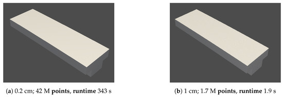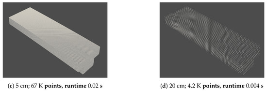 One of the main parameters needed for the 3D reconstruction is the choice of resolution. The resolution influences the number of points generated during the reconstruction process. This affects the runtime of the process and the memory size of the generated file. The selection of the resolution is dependent on the application of the reconstructed model. For example, if the reconstructed point cloud is to be fused with a laser scanner’s point cloud, a high resolution is recommended. Resolutions varying from 2 mm to 20 cm were selected for the reconstructed part of the bridge (2 m × 4 m × 13 m). The number of points and the corresponding runtime at each resolution are shown in Figure 6.