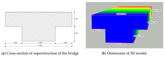 The Ottiliensteg is located in the eastern part of Freiburg and crosses the Dreisam river. It comprises three main parts: the north and south abutments and the concrete superstructure. The dimensions of the bridge are 2.28 m, 34.80 m and 3.5 m in width, length and height, respectively. The state office in charge of the bridges provided a single sheet 2D plan of various parts of the bridge that was used to reconstruct the 3D models, as shown in Figure 11. The bridge rails on each side of the bridge were also reconstructed as part of the superstructure of the bridge.