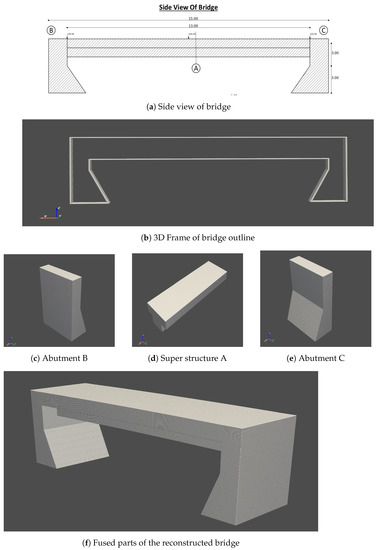 Figure 11. 3D reconstruction of Ottiliensteg foot bridge over the Dreisam river in Freiburg. (a) is the 2D plan used to reconstruct the parts of the 3D model. (c) is a 3D reconstruction of the concrete superstructure of the bridge. (b,d) is a 3D reconstruction of north and south abutments of the bridge. (e) shows the fused parts of the reconstructed 3D model of the Ottiliensteg foot bridge.