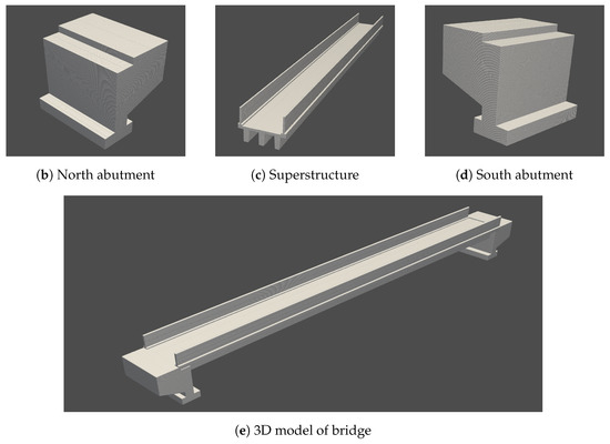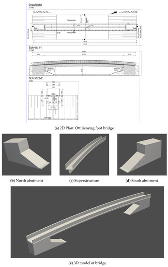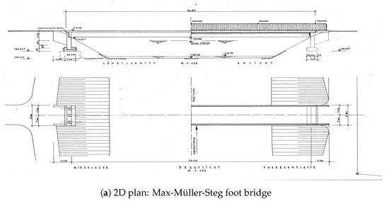 The Max-Müller-Steg is located in the eastern part of Freiburg and crosses the Dreisam river. It comprises three main parts: the north and the south abutment and the superstructure. The dimensions of the bridge are 2.8 m, 29.8 m and 2.95 m in width, length and height, respectively. The state office in charge of the bridges provided five 2D plans of various parts of the bridge that were used to reconstruct the 3D models, as shown in Figure 10. The bridge rails on each side of the bridge were also reconstructed as part of the superstructure of the bridge.