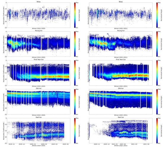 35]; therefore, the penetration depth of the scatterometer pulse is deeper in MYI than in newly formed ice, and the strong volume scattering leads to a higher σ
