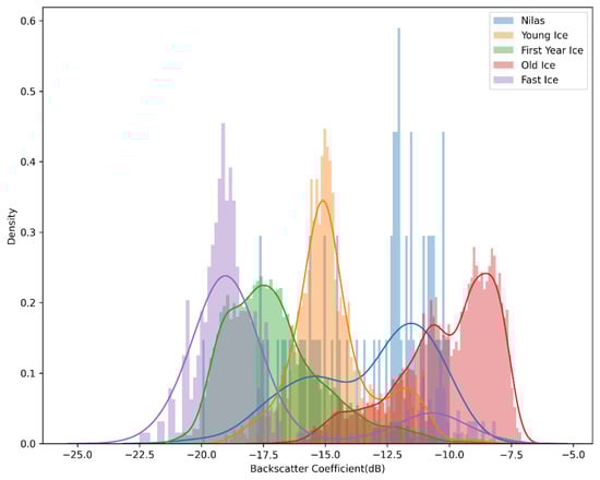 By analyzing time series histograms and monthly mean values of σ0 of each ice type, the values of σ0 of Young Ice, FYI, and Old Ice were found to be significantly different under VV polarization. In addition, Nilas and Fast Ice are significantly different from other ice types after introducing the polarization gradient ratio, and they can be distinguished by a nonlinear classifier.