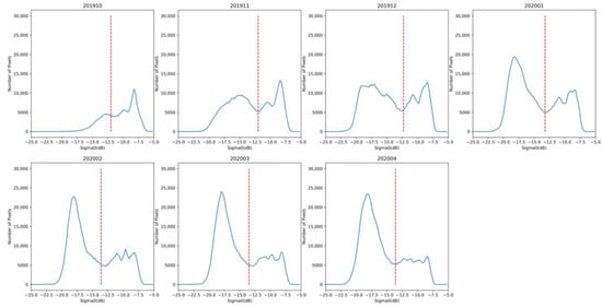 In the process, each HY-2B SCA monthly histogram was first plotted, and then for each histogram the lowest value between the bimodal peaks was adopted as the threshold for the month. Furthermore, the threshold was specified between –10 and –14 dB, and if there was no minimum between these values, a value of –12 dB was adopted. To reduce the error caused by histogram fluctuations, monthly histograms were used instead of daily histograms for sea ice classification.