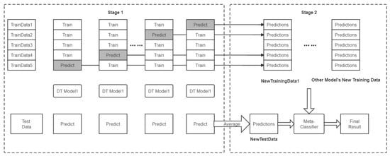 , time, and the pre-classification result were first used as the initial training data, which were divided into training and test sets at a ratio of 5:1, and the training data set was cross-validated using five-fold cross-validation. Then, one-fifth of the training set was adopted as the sub-test set, while the other four-fifths were taken as the sub-training set to train the same model five times and make predictions for each sub-test set that are then stitched together with other sub-test set results to make the training set for Stage 2. At the same time, the classification results of the five test sets were averaged and used as the test set for Stage 2. This process was applied to DT model 1, DT model 2, and the image segmentation method to generate the corresponding data and test sets. The final fusion model was trained with a simpler structured DT model.