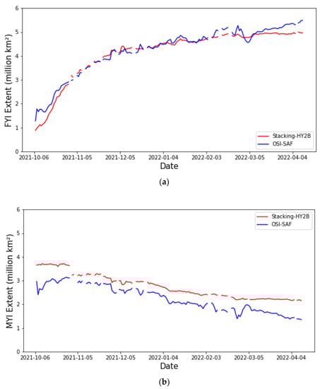 Figure 11, from October 2021 to April 2022. The sea ice extent was obtained by summing the area of each pixel point to calculate the total, removing the days with incomplete satellite data. OSI-SAF data only distinguishes FYI and MYI; therefore, the Nilas, Young Ice, and First Year Ice from Stacking-HY2B were classified as FYI and Old Ice was classified as MYI. Since Fast Ice is one-year-old ice in areas such as the Kara and Laptev Seas in the Arctic and MYI in the Canadian Arctic Archipelago, the areas classified as Fast Ice were not counted. Pixel points marked as ambiguous in the OSI-SAF data were not included in the calculation.