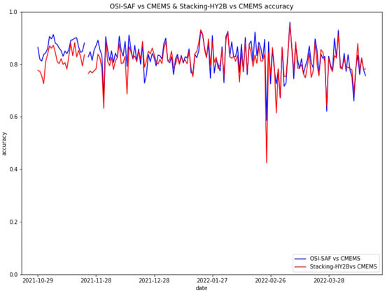 To further investigate the classification accuracy of Stacking-HY2B, we compared it to the CMEMS SAR-based sea ice type dataset. The accuracy evolution with time of Stacking-HY2B and OSI-SAF are shown in