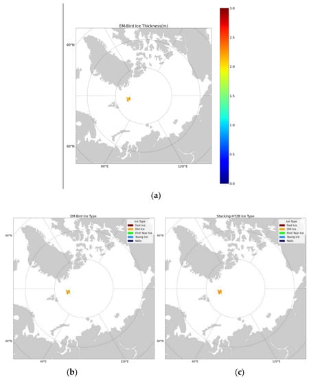 In the validation process, the proximity posterior probability of each ice type in the classification model can cause inaccurate ice type determination. For example, within the sea ice pixel at the edge of FYI and MYI, the probability of FYI of this pixel in the classification algorithm is close to the probability of MYI because of the close microwave properties of sea ice. The classification result of this pixel may not be determined correctly in this case. In turn, this results in Stacking-HY2B detecting a lower density of MYI, inducing a loss in classification accuracy. Furthermore, due to the regional limitation of CMEMS data and EM-Bird ice thickness measurements, Stacking-HY2B cannot represent the retrieval accuracy of the whole Arctic. Further evaluation and validation of the algorithm using other high precision data will be attempted in the future.