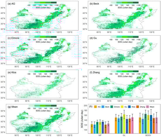 Spatial patterns of the mean start of the growing season (SOS) from 1982 to 2015 using six methods: (a) asymmetric Gaussian method (AG), (b) Beck’s method (Beck), (c) Elmore’s method (Elmore), (d) Gu’s method (Gu), (e) Klosterman’s method (Klos), (f) Zhang’s method (Zhang), and (g) the mean of all methods (Mean). (h) The means and standard deviations of SOS for 1982–2015 estimated by six methods and their means for the three vegetation types: mixed forests (MF), grasslands (GL), and barren or sparsely vegetated land (BOSV).