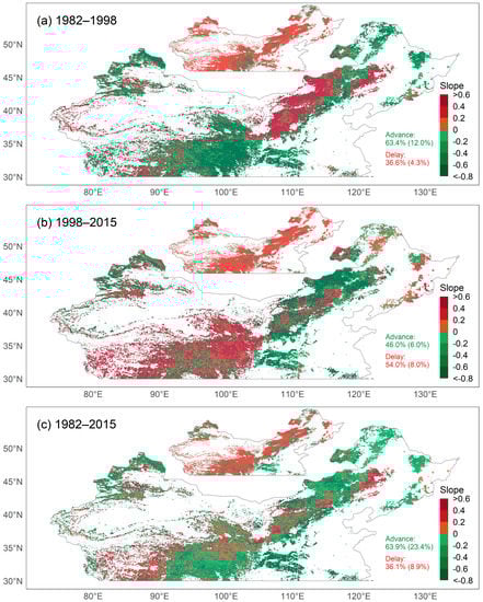 Map of temporal trends of the start of the growing season (SOS) during (a) 1982–1998, (b) 1998–2015, and (c) 1982–2015. The insets show the pixels with p ≥ 0.05 (red) and p < 0.05 (green). Percentages indicate the proportion of pixels with advanced or delayed SOS (percentage of pixels with p value < 0.05 in parentheses).