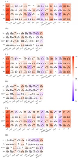 Comparing Figure 4(a1,b1,a2,b2), it can be found that the partial correlation coefficients between the extreme temperature indices, extreme precipitation indices, and SOS for 1982–1998 are similar to those for 1998–2015.