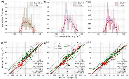 Overall, when comparing Chla-GCint to the best-performing product for each water type, the statistics were only marginally inferior, and the statistical metrics were comparable. Identical to Chla-GCint, Chla-GC and Chla-OC underestimated (overestimated) values greater (less) than 0.6 mg m−3 (Figure 2E,F); however, Chla-OC overestimated (underestimated) at a slightly greater degree, with a slope of 0.70 (Figure 2F). The distribution of Chla-GC followed the in situ Chl-a data distribution very closely up to about 0.6 mg m−3 and slightly overestimated the higher range of Chl-a; it began to diverge thereafter (Figure 2B). Similarly, the Chla-OC distribution followed the in situ curve, although not as closely as Chla-GC, and diverged at a lower Chl-a value of 0.3 mg m−3 (Figure 2C).
