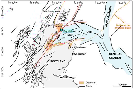 Devonian-age faults and fracture systems, usually sinistral strike-slip to dip-slip NW–SE- to NNE–SSW-trending faults, are thought to have formed during the regional transtensional opening of the Orcadian Basin (Figure 1) during the Early- to mid-Devonian [,,,,]. They have been recognised both in the outcrops of Caithness (e.g., [,,], in their Group 1 structures) and in the southern coastal region of the IMFB, in the Turriff Sub-basin [].