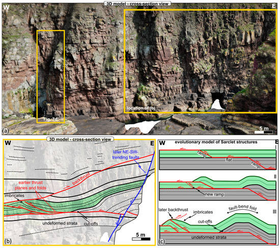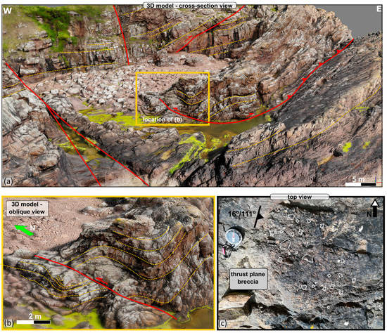 One good example can be observed in the high cliff face immediately north of the harbor (Figure 5a,b). In the middle section and to the east of the cliff, a large fold (of about 13 m amplitude) can be observed. The layers in the core of the fold (Figure 5b) are truncated against a sub-horizontal detachment plane dipping 3°–5° to the E, subparallel to the underlying beds (Figure 5b). The outer zone of the fold (Figure 5b in green) extends to the west, where it forms small-scale west-verging imbricates (Figure 5b). This structure formed most likely as part of a ‘staircase’ thrust system with a ramp–flat–ramp geometry (Figure 5c). The large fold seen in Figure 5b most likely represents a fault-bend fold developed over the ramp, which cuts through the lower stratigraphy (Figure 5c in grey). With further shortening, more thrusts appear to have developed in the upper stratigraphy forming the imbricate thrusts (Figure 5c in green). The hanging wall of these imbricates is later truncated against a top-to-the-E backthrust (Figure 5c).