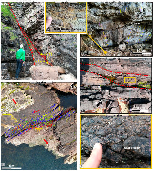 Field photographs of (a) a major NE–SW-trending fault present in the cliffs at Muiri Geo (see location on Figure 4b); (b,c) detailed view of the associated fault rock; and dip-slip lineations and grooves (yellow dotted lines) on the NE–SW-trending fault. (d) Fault core and (e) detail of fault breccia associated with (f) a major NE–SW-trending fault present at The Haven, note the wide highly damaged zone with en-echelon fractures array showing sinistral shear.