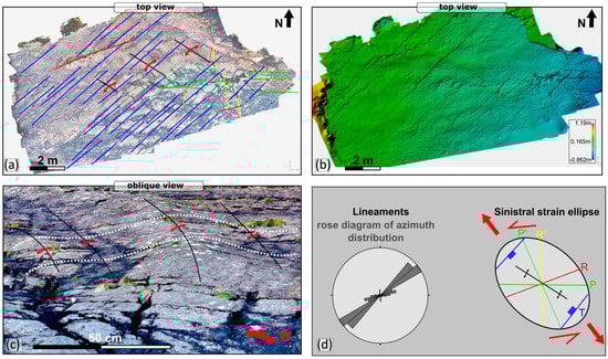 (a) Orthomosaic and (b) DEM model along strike of Figure 8f (see location on Figure 4b) showing en-echelon fractures array and small-scale folds also shown in oblique view in (c). (d) Rose diagram of azimuth distributions and strain ellipse showing fault array geometry suggesting a component of sinistral shear movement. Colours match the colours in (a) and (Figure 8f).