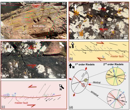 The timing of the strike-slip Riedel shear system observed at Muiri Geo locality (Figure 10), which includes NW–SE-trending sinistral and dextral ENE–WSW-trending faults, is more difficult to constrain. If those structures formed simultaneously, as suggested, during NNE–SSW extension, then their timing could be Cenozoic. This is due to a good correlation of this stress regime with both local stress regimes interpreted onshore and offshore along the southern coast of IMFB and inferred as Cenozoic []. Moreover, their proximity to the GGF would favor such an interpretation with dextral ENE–WSW-trending representing synthetic Riedel shear structures to the GGF and the NW–SE-trending sinistral, representing antithetic Riedel shear structures formed during Cenozoic dextral reactivation on the GGF (Figure 10).