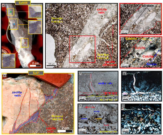 The SaN06 sample (Figure 11a) was taken from an N–S-trending white calcite vein (Figure 7a and Figure 11a), which on the basis of observed crosscutting relationships, appears to be the earliest vein set seen in the outcrops. In the thin section, the veins are curviplanar and have local mesh-like offshoots (Figure 11b). Larger veins are composite and likely syntaxial with finer calcite outer zones, coarser sparry calcite inner zones and locally, a fine central mixture of calcite, zeolite and local siderite (Figure 11d). Most offshoots are the sparry variety of calcite (Figure 11b). The youngest fills—including zeolite and siderite in places—are lightly oil-stained, notably in the region adjacent to the contact region of the zeolite-bearing fill (Figure 11c).