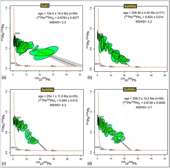 For SaN06a (Figure 11a), 71 spots were ablated and plotted on a Tera–Wasserberg U-Pb plot which yielded a 238U/206Pb age of 258.46 ± 4.45 (2σ, Pbinitial = 0.820 ± 0.014, MSWD = 4.2; Figure 12b).