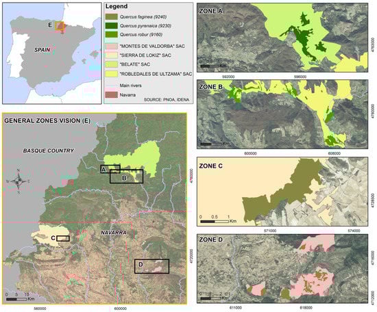 The oak groves under study are located in Navarra Province, which has one of the highest levels of biodiversity in the EU due to the confluence of the Alpine, Atlantic, and Mediterranean biogeographic regions []. A total of four study zones have been selected, where three habitats were studied: Quercus faginea (9240), Quercus pyrenaica (9230), and Quercus robur (9160) (Figure 1).
