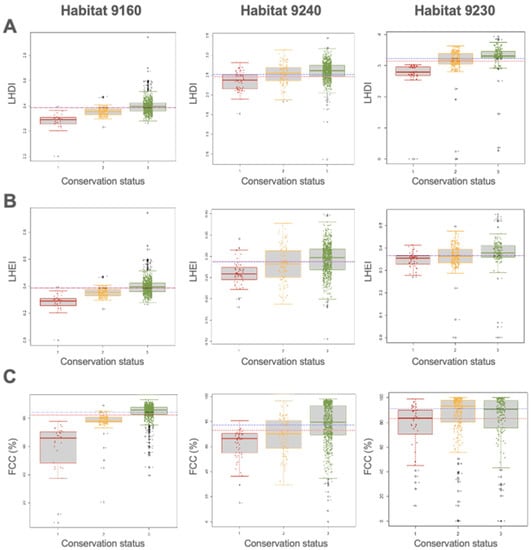 Box plot diagrams of the significant variables (A) LHDI, (B) LHEI, and (C) FCC (%) between conservation status for habitats 9160, 9240, and 9230. The dashed blue line denotes the median, and the dotted red line is the average mean. 1: unfavorable-bad status (red); 2: unfavorable-inappropriate status (yellow); 3: favorable status (green). Additionally, 9160 is Quercus robur habitat, 9230 is Quercus pyrenaica habitat, and 9240 is Quercus faginea habitat.