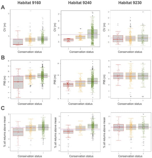 Box plot diagrams of the variables (A) CV (m), (B) P95 (m), and (C) % of all returns above the mean between the different conservation statuses for habitats 9160, 9240, and 9230. The dashed blue line denotes the median, and the dotted red line is the average mean. 1: unfavorable-bad status (red); 2: unfavorable-inappropriate status (yellow); 3: favorable status (green). Additionally, 9160 is Quercus robur habitat, 9230 is Quercus pyrenaica habitat, and 9240 is Quercus faginea habitat.