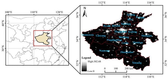 Meanwhile, to assess the continuity of the NPP-VIIRS-like NTL dataset in the time series, our study compared the correlation between the NPP-VIIRS-like NTL dataset and the GDP data in Henan Province using a linear regression model. As shown in Figure 3a, we counted the total light intensity of the NPP-VIIRS-like NTL in Henan Province for the twenty-year period from 2001 to 2020 for correlation analysis with the statistical GDP of Henan Province. The results show that the NPP-VIIRS-like total intensity is highly correlated with the GDP data with an accuracy of 0.9171, and there is a consistent trend between the NPP-VIIRS-like NTL dataset and the GDP data. Figure 3b shows the analysis of the change trend of the NPP-VIIRS annual synthetic NTL data and NPP-VIIRS-like NTL dataset in Henan Province in 2012, and it can be seen that the two data fluctuation trends can be well matched. The results show that the NPP-VIIRS-like NTL has good temporal consistency in Henan Province and meets the requirements for use in this experiment. The 20-year NPP-VIIRS-like NTL dataset for the period 2001 to 2020 used in this study is freely available through the Harvard Dataverse platform (https://doi.org/10.7910/DVN/YGIVCD (accessed on 12 March 2022)), and is stored in the GeoTIFF format. The NPP-VIIRS-like data downloaded from the Harvard Dataverse platform are global NTL data, which needed to be cropped according to the vector boundaries of Henan Province. The cropped images of the study area were reprojected with the Lambert equal area and resampled to a 500 m grid scale.