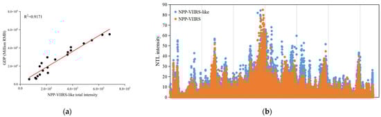 Evaluation of temporal consistency of the NPP-VIIRS-like NTL data in Henan Province. (a) Correlation between NPP-VIIRS-like NTL total intensity data and GDP data in Henan, and (b) variation trends of NPP-VIIRS annual synthetic NTL data and NPP-VIIRS-like NTL data sets in 2012 in Henan Province.
