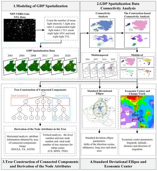 Technical flow chart of the study: (1) modeling GDP spatialization; (2) GDP spatialization data connectivity analyses; (3) tree construction of connected components and derivation of the node attributes; (4) standard deviation ellipse and economic center.