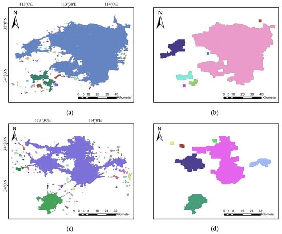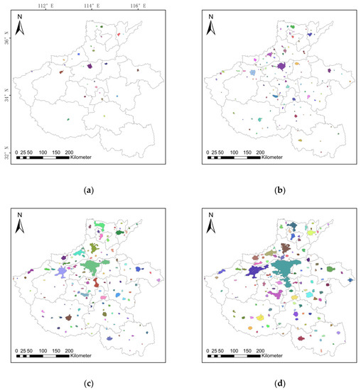 Figure 10a shows the level 1 connected components in Henan Province in 2001, and it is clear that the number of connected components was small. Each city had only one or a few scattered urban connected components. Only Zhengzhou had a large, connected component, and the areas of the other connected components were very small. A special case is Xinyang City, which had no connected components within the regional area. Figure 10b shows the level 1 connected components in Henan Province in 2007, when the number of the connected components increased significantly, but with no significant change in the area of the connected components. Figure 10c shows the level 1 connected components in Henan Province in 2014. The number of connected components increased, and the areas of each connected component also increased. The shapes of the connected components show the economic trends within each city. For example, according to the shape of the largest connected component in Zhengzhou, it can be seen that since 2007, Zhengzhou developed significantly in the east and south, and the eastern section joined with the connected component of Kaifeng. Figure 10d shows the level 1 connected components in Henan Province in 2020; there was no significant change in the number of connected components compared with previous years, while the areas of connected components changed significantly. In the process of the urban development, the urban center and the surrounding areas underwent coordinated development, the connecting parts of the connected components between the cities increased, the areas of the connected components increased, and the number of connected components tended to decrease.