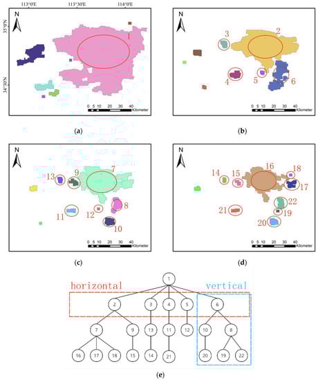The tree structure comprises an expandable organization with unlimited levels, and each “label” in the organization is an “element” of the tree structure, which can be expanded without limit, either horizontally or vertically. Using the connected component tree structure generated using the GDP spatialization data, the horizontal expansion represents the number and scale of the economic centers at this level. The vertical expansion involves each connected component being expanded one level down, and the expanded connected area must be related to one of the connected component elements in the horizontal group above it, which indicates the depth and direction of the region’s economic development []. According to the characteristics of the tree structure, the node attributes are counted from either the horizontal or the vertical directions. As shown in Figure 6e, “Horizontal” and “Vertical” are indicated by the red and blue dotted rectangles.