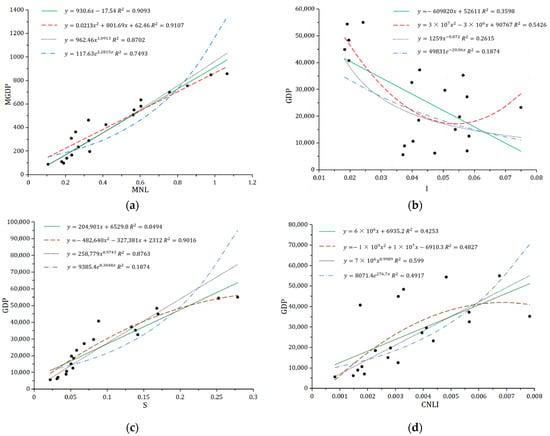 Regression models of the NTL indices and GDP parameters: (a) MNL and MGDP, (b) I and GDP, (c) S and GDP, and (d) CNLI and MGDP.