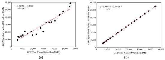 Relationships between GDP simulation values, GDP spatialized values, and GDP true values in Henan Province from 2001 to 2020: (a) GDP simulation values and GDP true values, (b) GDP spatialized values and GDP true values.
