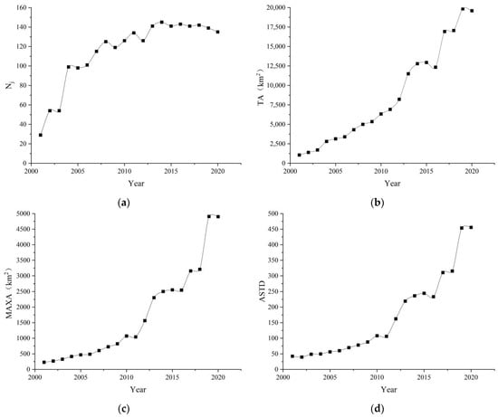 Figure 11 shows the changes in the attribute information of the level 1 connected components in Henan from 2001 to 2020, including Nj, TA, MAXA, and ASTD. By observing the four-attribute information of the connected components, we find an obvious rule. The change trend of the four-attribute information of the connected components in Henan shows overall increases to varying degrees. However, taking 2012 as the limit, Nj in Henan increased rapidly before 2012, while TA, MAXA, and ASTD increased relatively slowly. The change trend from 2012 to 2020 was the opposite; Nj increased relatively slowly, and TA, MAXA, and ASTD increased rapidly. This was due to the national emphasis on coordinated and balanced regional development, active urbanization, and efforts to improve the quality of urbanization in 2012, which has greatly improved the urban economy in Henan Province. Although Nj increased relatively slowly, TA, MAXA, and ASTD increased rapidly, and the economic development differences between cities were gradually reduced. In addition, with the increase in the area of the connected components, the connected parts of the connected components increased, and the number of connected components tended to decrease.