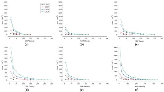 Figure 9 presents the maps generated with pixel-level spatial information based on the NTL indices. The figure shows the pixel-level GDP spatialized density maps for 2001, 2004, 2008, 2012, 2016, and 2020. The pixel-level (500 m × 500 m) GDP spatial density maps provide the GDP spatial information to address the limitations of the GDP statistics, and can reflect the spatial changes in the GDP more intuitively and meticulously. The size and range of the GDP spatial density values are the most intuitive ways to measure the development of a region; the larger the area and the higher the brightness, the better the economic development situation of the location. It can be seen intuitively in the GDP density maps that the economic development of Henan Province has changed significantly from 2001 to 2020. In the early stage, there were few areas with high GDP density values, which only existed in a small number of urban areas and were relatively scattered. The overall economic development level was low, the economic centers were scattered, and the ratio of high economic areas to the total urban area was small. With the passage of time, the GDP density became centered in the urban areas and continued to expand into the surrounding counties. The economic center gradually developed at a multicenter scale, and the ratio of higher economic areas to the total urban area increased. According to the spatial density maps of GDP, it can be seen that the economy of Henan Province has developed rapidly in the past 20 years, but the regional economic development varies greatly. Zhengzhou in the central region is the economic center of Henan Province, with a larger GDP density value, followed by Luoyang and Kaifeng. Anyang, Hebi, Xinxiang, Xuchang, Luohe, Zhumadian, and Xinyang form a strip-shaped economic belt along the Beijing-Guangzhou Railway. The cities along the railway line form a small urban center, and there may be multiple economic centers within the same city along different traffic roads. The regions with lower GDP density values are mainly distributed in the western and southwestern regions, where the level of the economic development is lower. Overall, the GDP density maps obtained based on the NTL indices have good timeliness and linkages that can be used to analyze the linkage mechanisms of the GDP growth and can thus be used as a database for the analysis of the spatial and temporal evolution of urban economies.