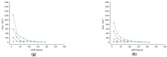 To analyze the economic changes in the urban areas in the eight cities, we selected the new first-tier city Zhengzhou; the third-tier cities Luoyang, Zhumadian, and Zhoukou; the fourth-tier cities Anyang, Kaifeng, and Pingdingshan; and the fifth-tier city Hebi; the GDP spatialization data were counted as a tree structure. Figure 12a–d represent the tree structure information of the cities for four years: 2001, 2007, 2014, and 2020. The abscissa represents the hierarchical level of the tree structure; that is, the longitudinal depth and the GDP density of a city’s economic center. The ordinate represents the number of nodes on each level of the tree structure; that is, the number of urban economic centers. The number of nodes on each level of the tree structure in the eight cities decreased as the hierarchical level of the tree structure increased.