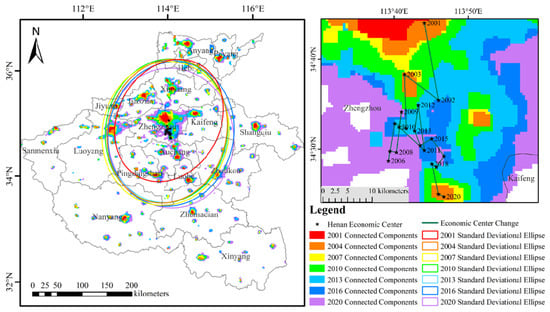 - Standard deviation ellipses were used to analyze the distribution ranges and development directions of the economic center of Henan Province and the cities, and to analyze the spatial and temporal evolution of the economy. From 2001 to 2020, the economy of Henan Province developed rapidly, and the overall economic center was relatively stable. The economic center of Henan Province has always been located in Zhengzhou City, the direction of economic development in Henan Province is clear, and the economic center generally shows a trend of moving to the southeast. The economic center of Zhengzhou is also relatively stable as a whole. The economic development trend of Zhengzhou is roughly the same as the overall development trend of Henan Province, and the economic center also generally shows a trend toward the southeast. In the past 20 years, the cohesion of Henan Province’s economic development has gradually become stronger. The economy of Henan Province is centered on Zhengzhou City, which drives the common development of the surrounding cities, and the economic center shows a trend of southward development.