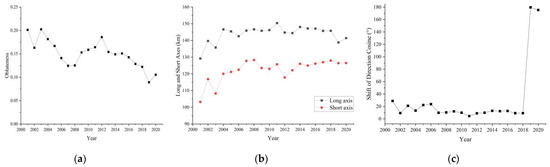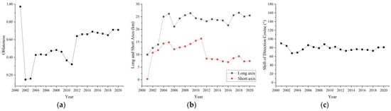 Zhengzhou data from 2001–2020 standard deviation ellipse parameters: (a) oblateness, (b) long and short axes, and (c) shift of cosine direction.